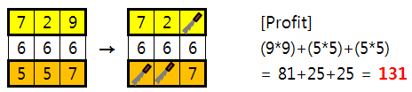 예를 들어 위 [Fig. 3]과 같이 꿀을 채취할 경우, 꿀의 양이 6, 1, 8인 세 개의 용기가 얻어지며 이때 수익의 합은, (6*6) + (1*1) + (8*8) = 36 + 1 + 64 = 101 이 된다.